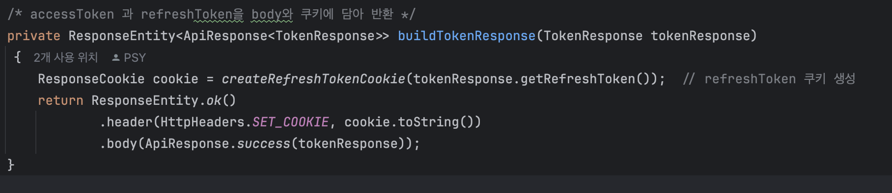 그리고 기존에는 로그인을 성공하게 되면 응답으로 body에 accessToken과 refreshToken을 담아서 보냈는데 그렇게 되면 accessToken과 refreshToken 모두 localStorage나 인메모리나 세션등에 저장해야 하는데 accessToken은 유효시간이 짧기 때문에 문제가 될 여지가 적지만 refreshToken을 localStorage나 인메모리에 저장하는 것은 스크립트 구문 실행을 통해 탈취될 여지가 있기 때문에 스크립트로 접근할 수 없는 HttpOnly 쿠키에 담아서 보내는 것으로 수정하였고 accessToken은 접근성과 짧은 유효시간을 고려하여 인메모리, 즉 Pinia 전역 상태에서 관리하는 것으로 결정하였습니다.