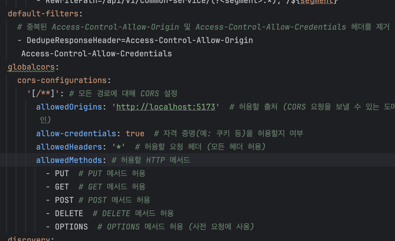 우선 기존 Postman에서 api 테스트를 진행했을땐 CORS 정책에 대한 고민을 안했었는데 Vue 호스팅 도메인에서 axios로 api를 연결할 땐 다른 도메인에서 호출을 하게되므로 CROS 문제가 발생하였고 저희는 Spring Gateway에서 모든 인증을 처리했기 때문에 Spring Gateway의 application.yml에서 다음과 같이 CORS 설정을 추가하게 되었습니다.