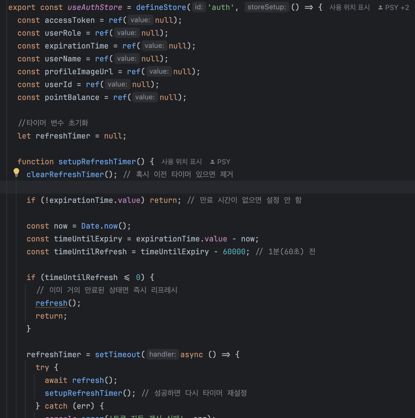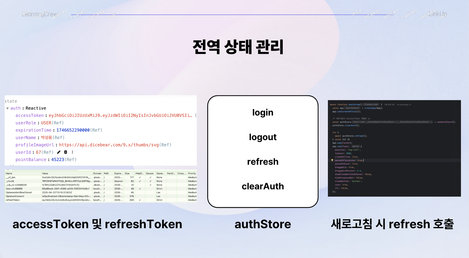 인증과 관련한 모든 코드들 예로들어 login, logout, refresh, clearAuth 메서드는 모두 useAuthStore에서 집중 관리하도록 하였고 필요시에 가져다 사용할 수 있도록 구현했습니다.