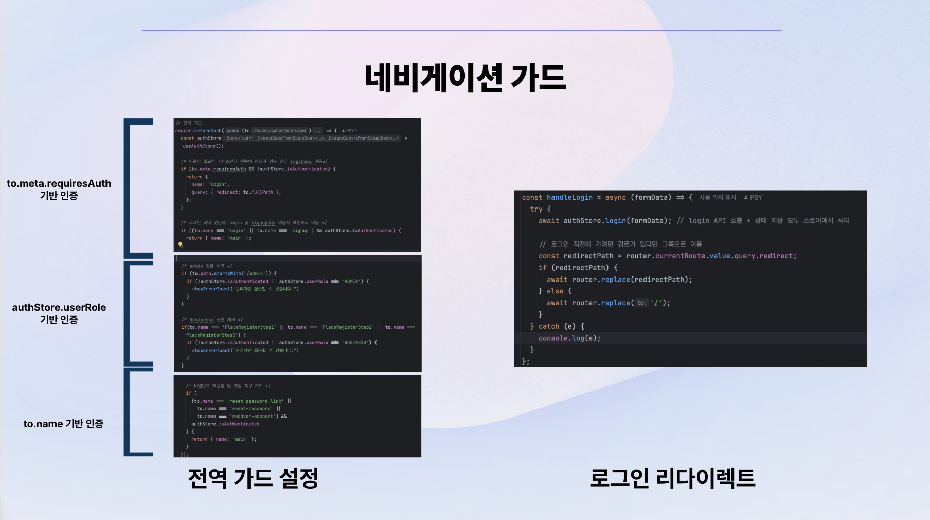 그리고 저희는 총 3개의 권한이 있습니다. user, business, admin인데요. 페이지별로 접근 권한이 각기 달랐기 때문에 도메인으로 접속하지 못하도록 네비게이션 가드를 설정해야 했고 인증이 필요한 페이지의 경우에는 설정한 라우터 메타 정보로 판별했고 권한의 경우엔 useAuthStore에서 관리하는 role로 접근 여부를 판별하여 권한별 가드를 설계했습니다.