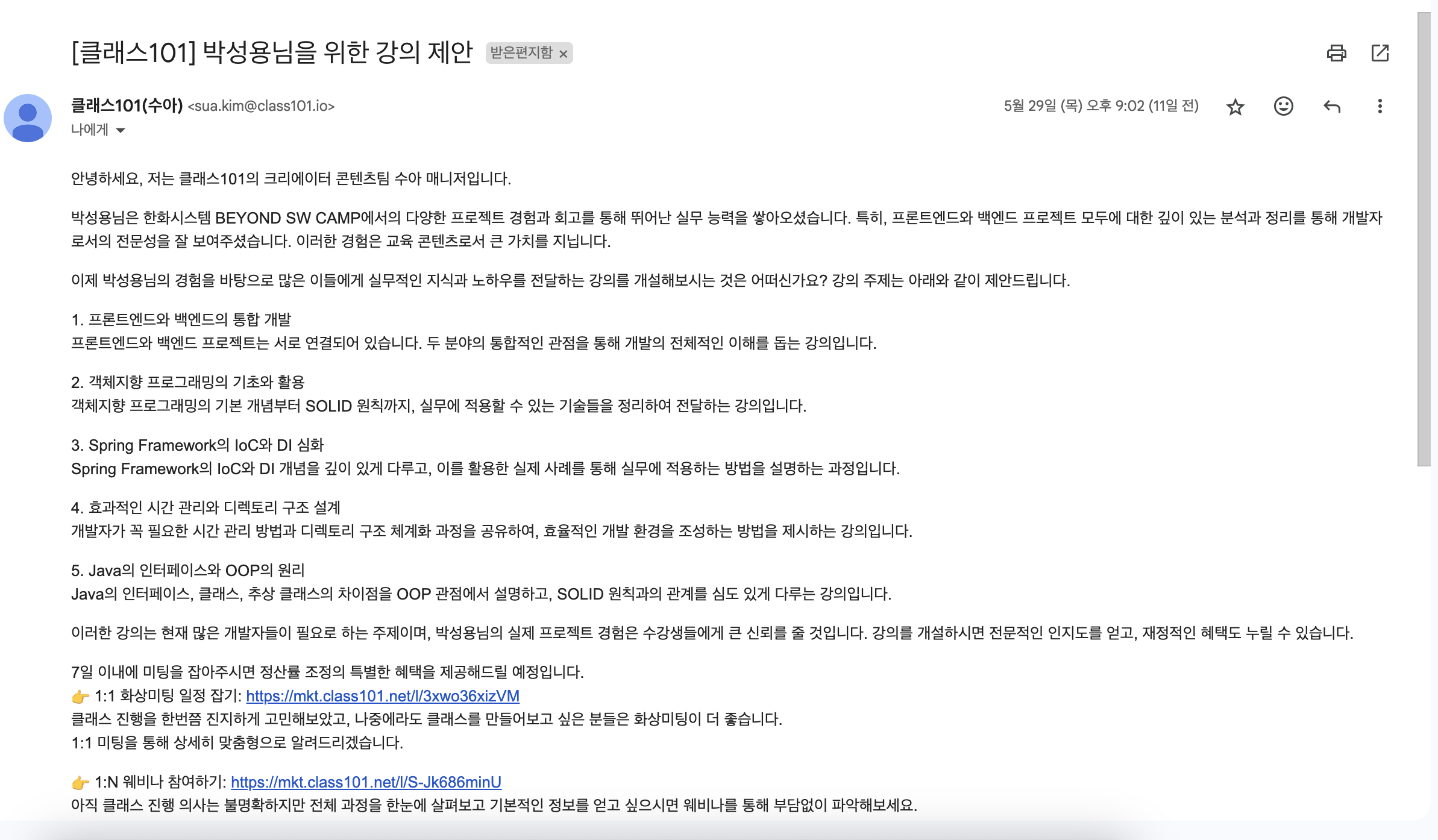 클래스101에서 강의 제안을 받았고, 아마도 제가 작성해온 블로그 글이나 회고들을 보고 연락을 주신 것 같습니다. 아직은 강의를 시작할 생각은 없지만 제가 기록해온 것들이 누군가에게 긍정적으로 다가갔다는 사실이 너무 기뻤습니다.
