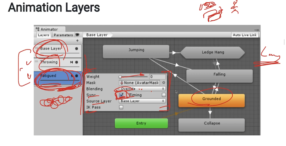 애니메이션의 레이어를 추가하여 분할하여 애니메이션을 추가할 수 있다. 여러 애니메이션을 사용할 수 있거나 애니메이션의 중요도를 다르게 줄 수 있다.