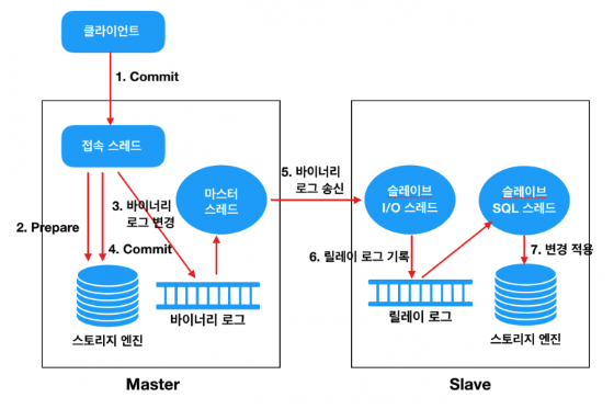 Master 노드에서 변경되는 데이터에 대한 이력을 로그(Binary Log)에 기록하면, Replication Master Thread 가 (비동기적으로) 이를 읽어서 Slave 쪽으로 전송하는 방식이다.