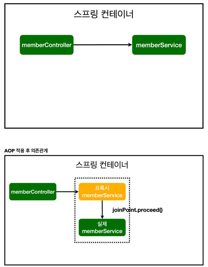 - 아래의 그림과 같이 컨트롤러가 서비스를 호출하는 과정사이에 공통 관심사항 로직을 실행하게 하는것이다.