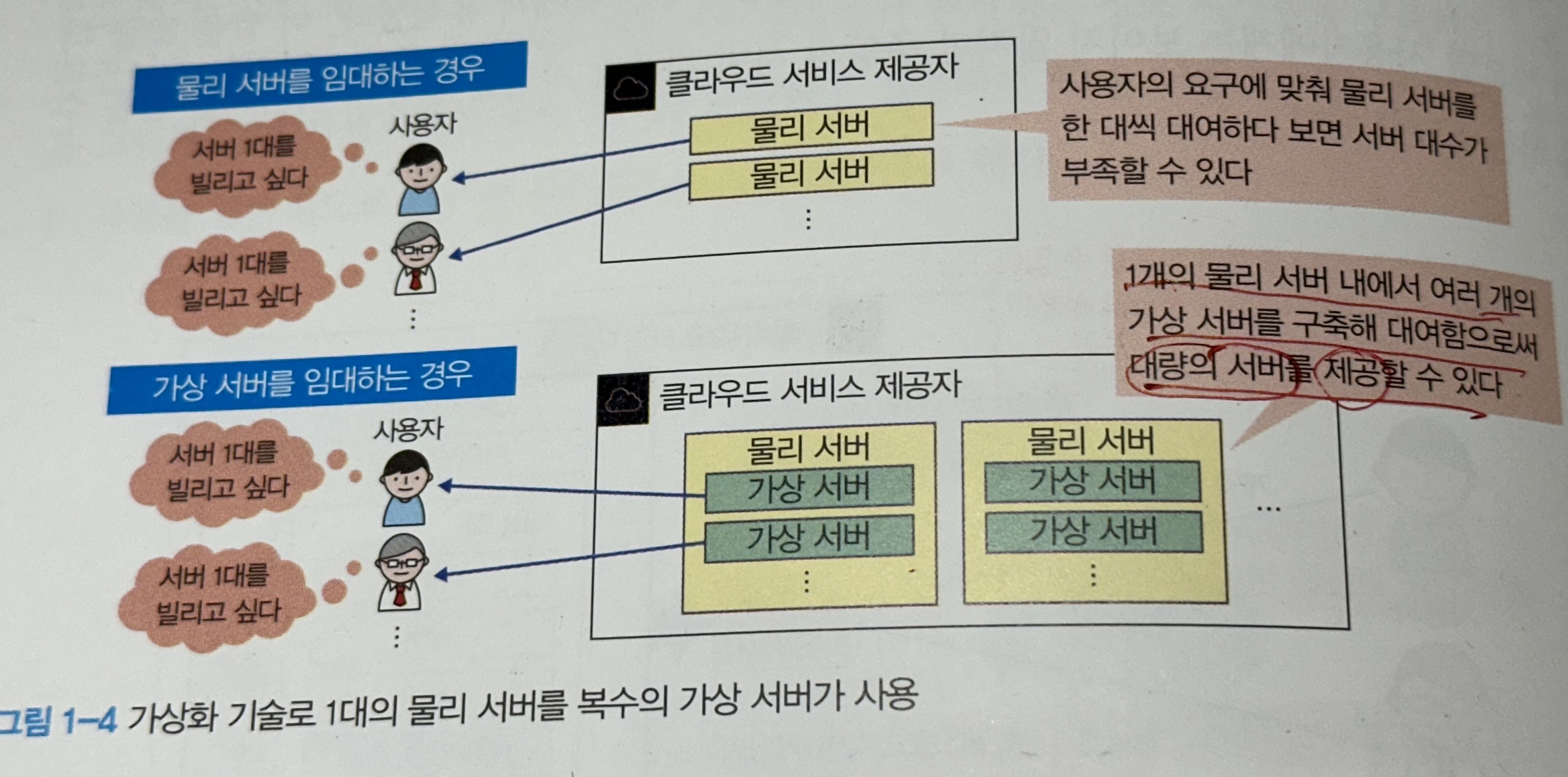 클라우드 서비스에서 사용자는 서버를 임대해 사용한다. 사용자가 사용하고 싶은 사양으로 서버를 선태가면 가상화 기술을 이용해 해당 사양의 서버를 가상으로 생성해 사용한다.
