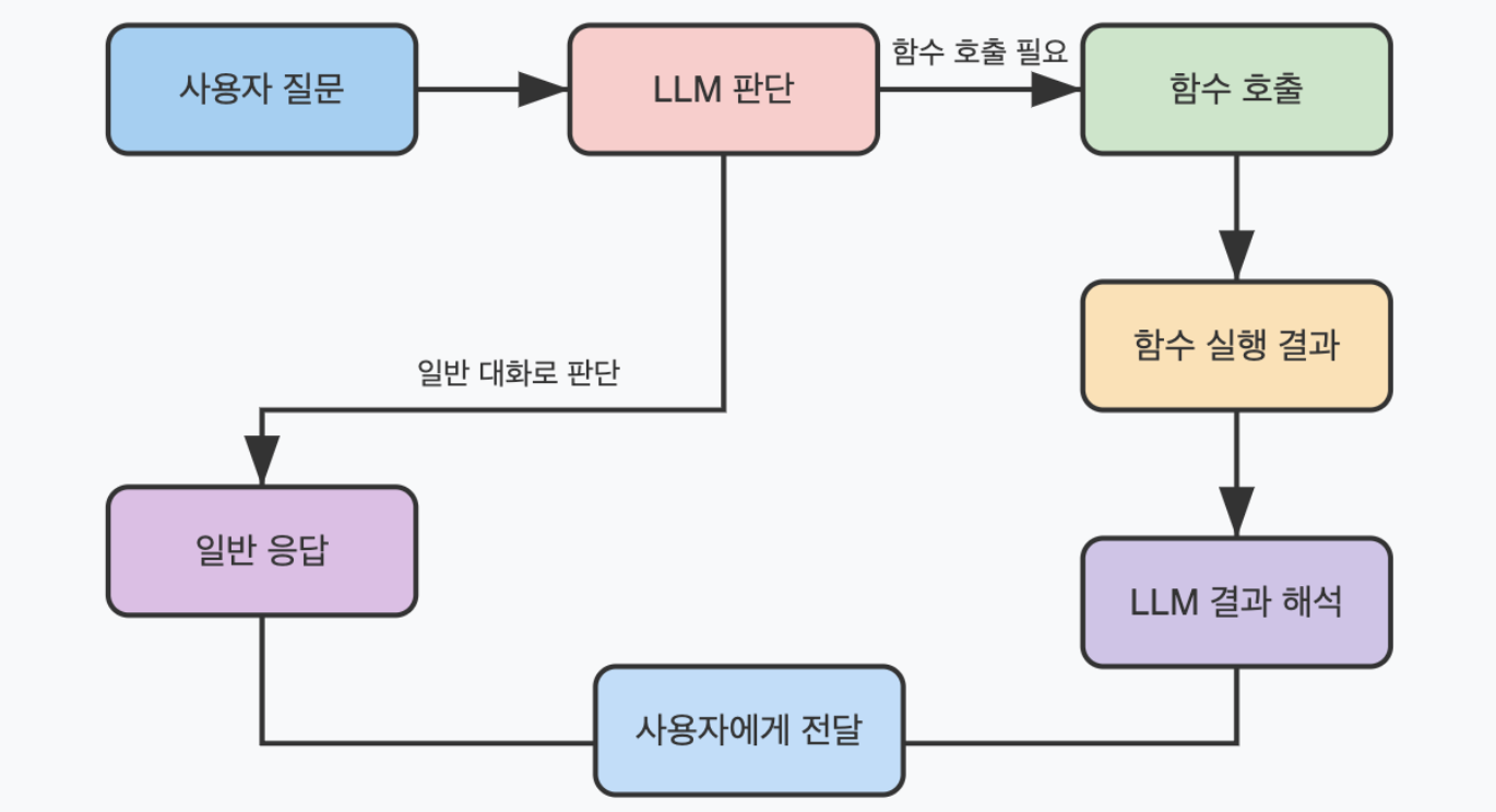 이런 질문을 받았을 때 LLM 은 적절한 함수를 선택하고 필요한 파라미터를 추론한 뒤, 함수를 호출해 얻은 결과를 이용해 답변을 생성한다.