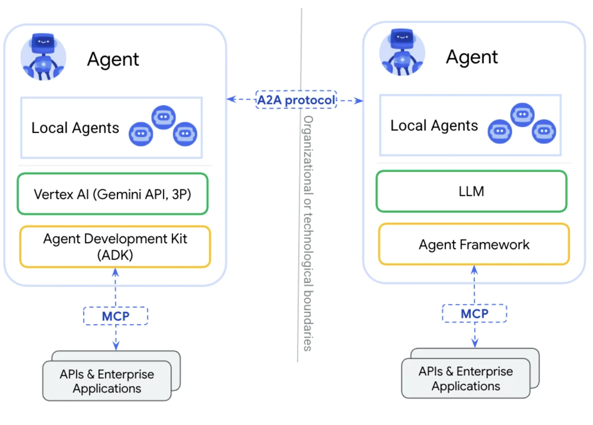 결국 A2A는 각 Agent가 톡립적인 추론 과정을 통해 적합한 다른 Agent와의 협력을 하고, MCP는 하나의 Agent가 외부 리소스를 보조 수단으로 활용해 문제를 해결하는 것이다.