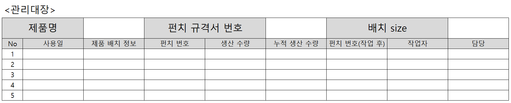 펀치관리대장은 아래의 form을 출력 하여 사용자가 수기로 값을 기록 관리 하며, 대장 예시는 아래 사진과 같습니다.(보안 문제로 실제 대장을 upload 하지 못 하고, 비슷한 form을 만들어 upload 하였습니다.)