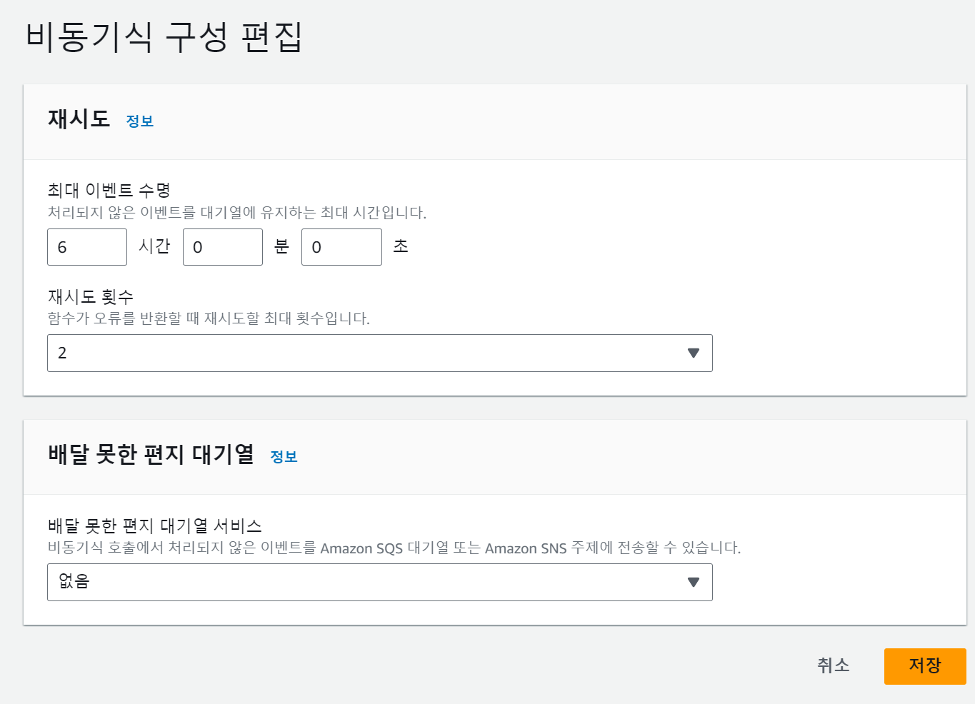 비동기식 호출을 설정할 때엔 비동기 호출 이벤트 만료기한과 재시도 횟수를 같이 선언해줄 수 있다. 또한 처리되지 않은 이벤트들을 SQS, SNS에 전송하는 방식으로 처리 못한 이벤트들을 로깅할 수 있다.