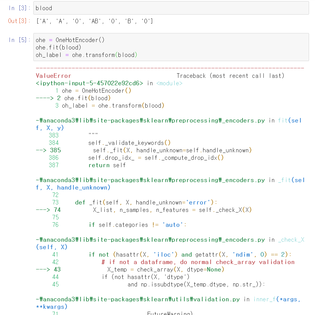 리스트인채로 Onehot은 불가능했다. Onehot은 Numpy에서 배열로 변환해줘야 한다. 배열도 1열 배열(?)로 변환시켜줘야 한다.