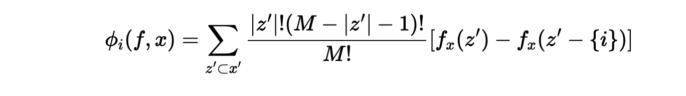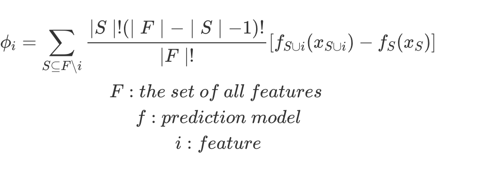 ϕi는 기여도 이고, S⊂F 를 만족하는 모든 set s 에대하여 feature i 가 있을때와 없을때의 score의 차이