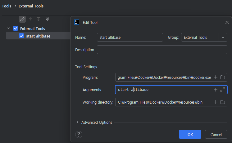 Program에는 docker.exe가 설치된 경로가 들어가야하고