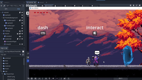 그후 interact로 설정한 e버튼을 누를 경우 이후에 다룰 Dialogic을 통해 timeline이 실행되어 npc와 대화가 가능합니다.