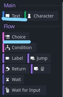 다음으론 choice인데 단순히 설정된 문구만 표시하는 것이 아닌 대화의 선택지를 부여하는 기능을 합니다. text하단에 추가하여 질문과 대답을 작성하면 됩니다.