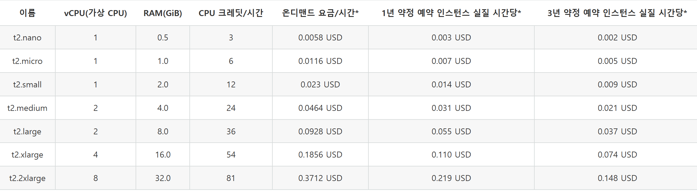 ec2에서 프리티어로 제공하고 있는 t2인스턴스는 t2.micro.