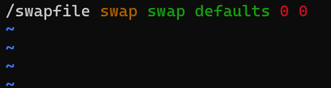 편집기에서 파일을 연 후 파일 끝에 다음 줄을 새로 추가하여 부팅 시 스왑 파일을 활성화해주자...!