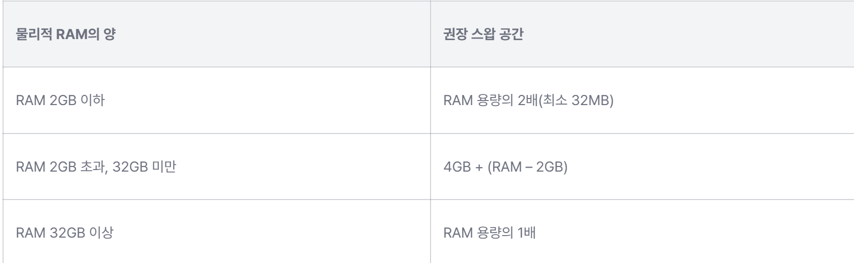 - 메모리에 따라 AWS가 권장하는 스왑메모리의 크기