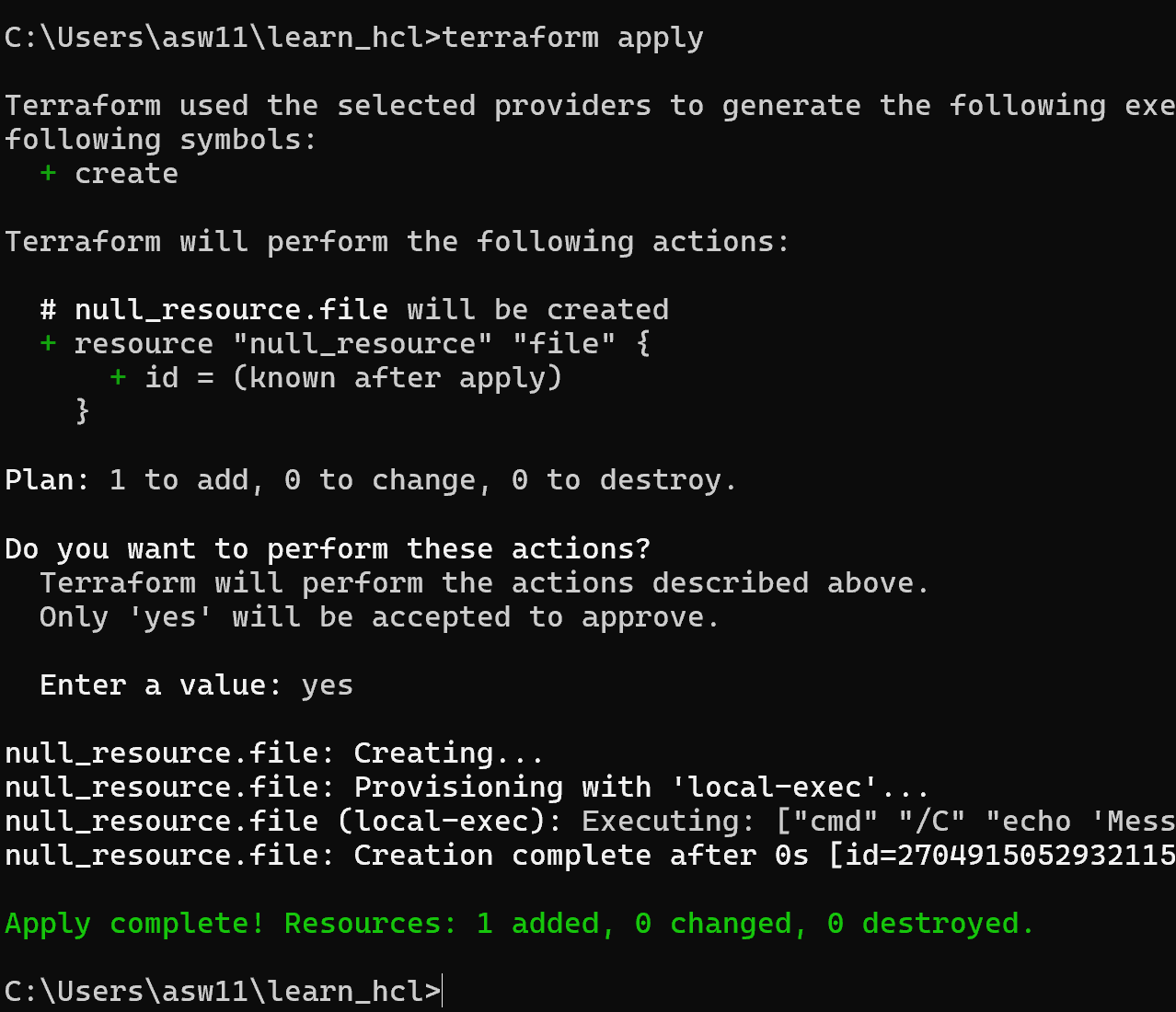 message = "Hello ${upper(local.name)}! I know you like ${join(",", local.fruits)}"