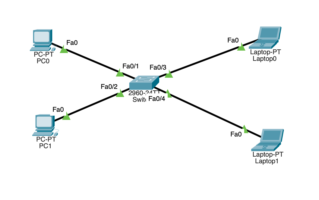 - Switch0의 포트 : FastEthernet0/1, FastEthernet0/2