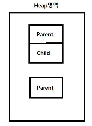 자식클래스가 new해서 생성된 instance는 부모 클래스와 is a관계를 가지고 있다. 그래서 자식클래스는 얼마든지 부모클래스에 접근할 수 있다. 자식클래스를 new했을때, 메모리에 올라가는 구조를 먼저보자. 아래그림과 같이, 자식클래스가 new되면 부모클래스도 같이 올라간다. ,