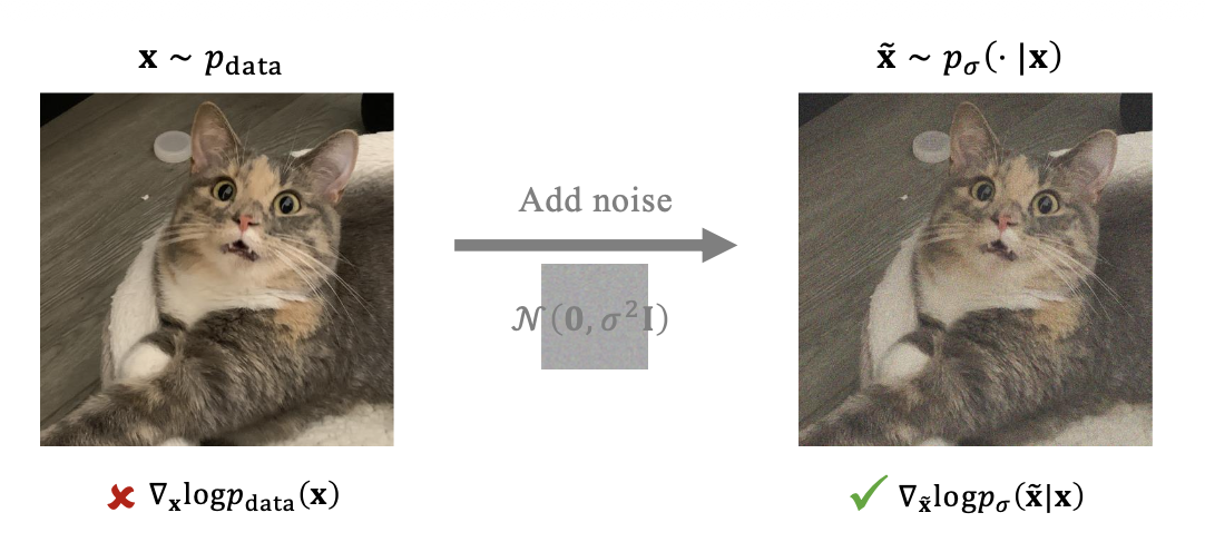∇ x log p data ( x ) \nabla_\mathbf{x}\log p_\text{data}(\mathbf{x}) ∇ x log p data ( x ) 의 intractability를 극복하기 위해 Vincent(2011)는 알려진 조건부 분포 p σ ( x ~ ∣ x ) p_\sigma(\tilde{\mathbf{x}}|\mathbf{x}) p σ ( x ~ ∣ x ) 를 통해 데이터 x ∼ p data \mathbf{x}\sim p_\text{data} x ∼ p data 에 노이즈를 주입하는 방법 을 제안했다.