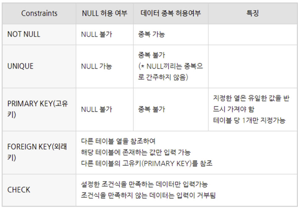제약조건(constraint)이란 데이터의 무결성을 지키기 위해, 데이터를 입력받을 때 실행되는 검사 규칙을 의미한다.