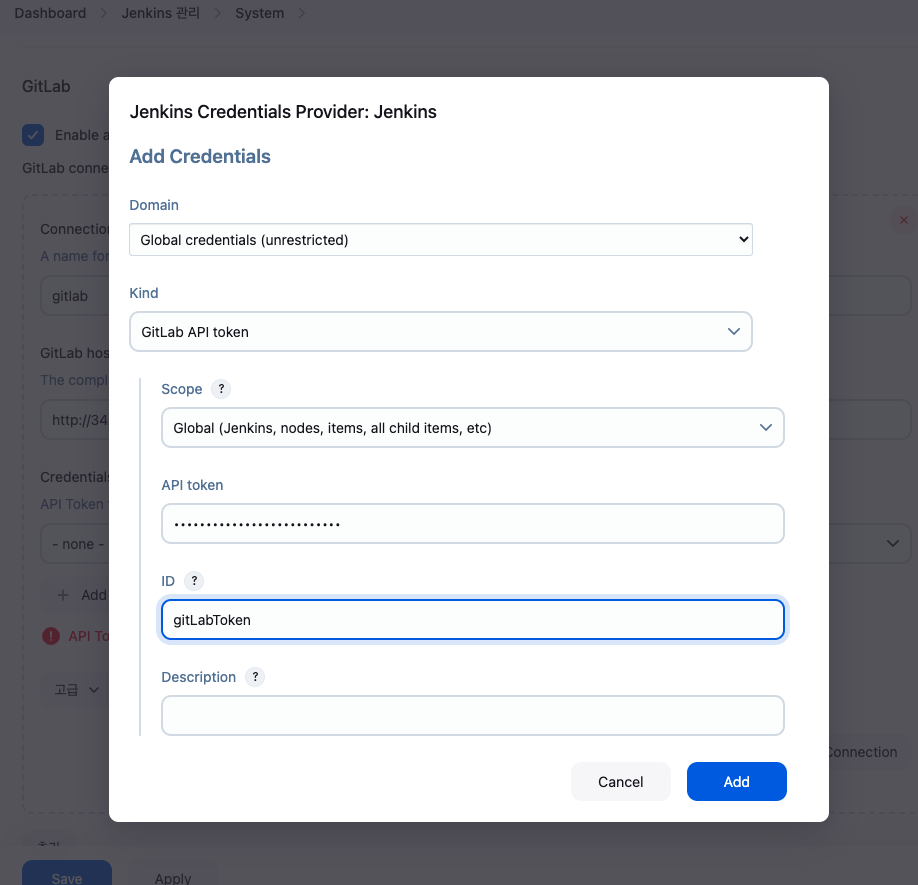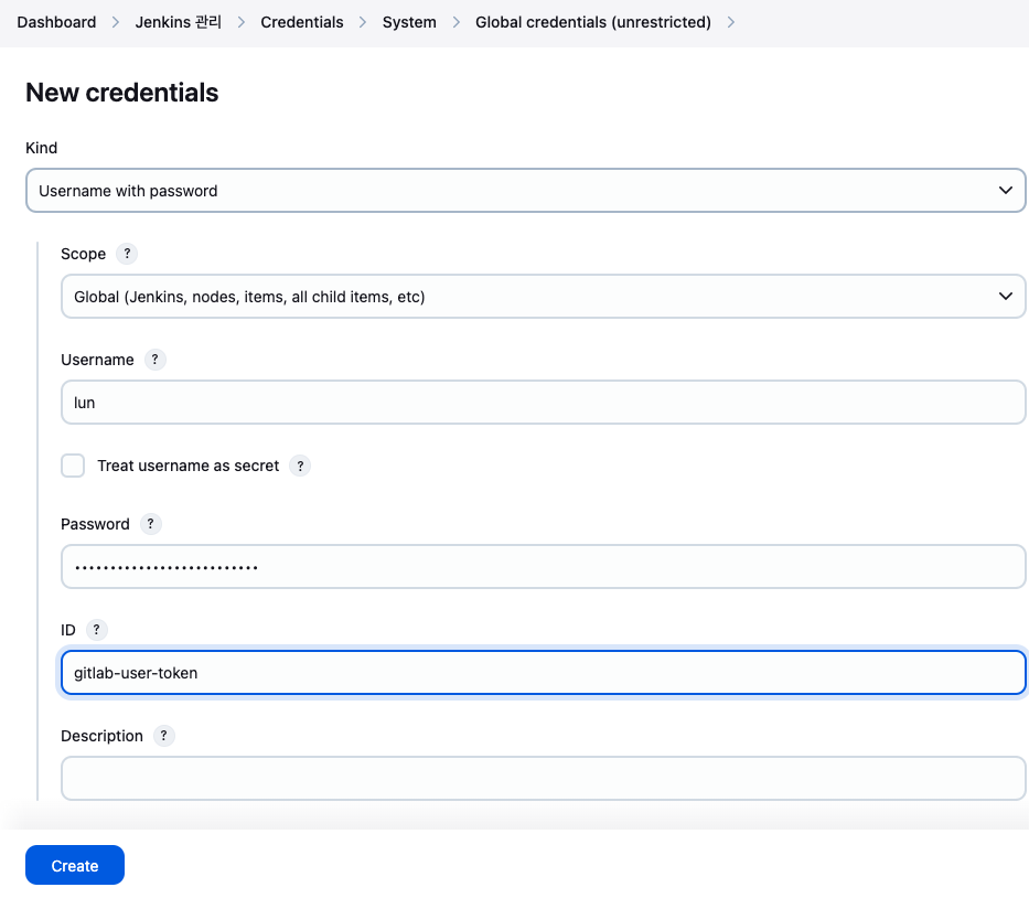 - Jenkins > Jenkins 관리 > Credentials > System > Global credentials