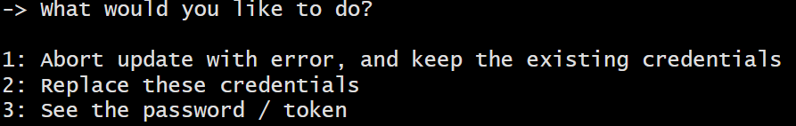 2번을 선택하면 기존의 credentials가 삭제되고 새로운 토큰을 입력하라고 나오는데 그곳에 새로 발급받은 토큰을 입력하면 된다.