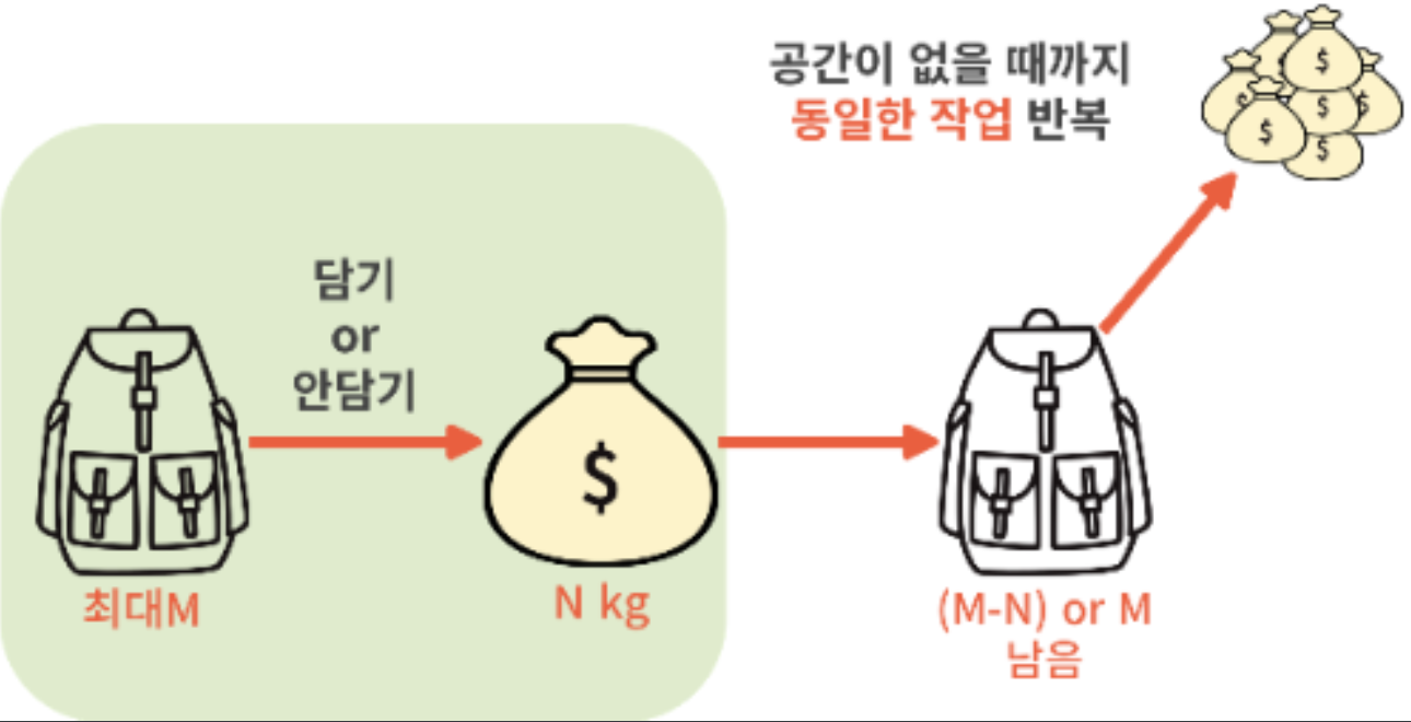 그림에서처럼 배낭에 넣을지 안 넣을지 선택을 하면 되는데 넣는 경우라면 최대 M까지 담을 수 있는 배낭이 있다고 했을 때 배낭에 공간이 (M-N) 으로 남거나 그대로 M이 남거나 입니다.