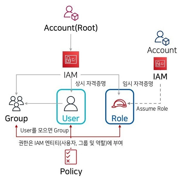 최고 관리자가 Root 계정을 관리하고, 그 밖의 사용자들은 각자 계정을 발급받아 제한된 권한을 가지고 AWS를 사용한다.