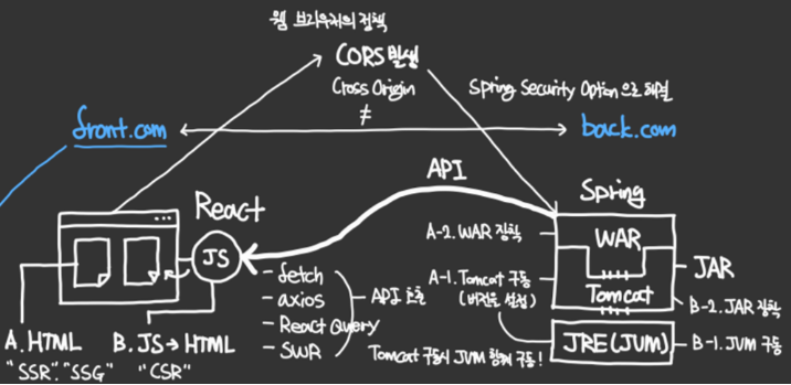 위 그림처럼 front.com 과 back.com 을 연결할 때 CORS가 발생하는데 Cross Origin때문에 발생한다. 이것은 Spring Security Option으로 해결 가능하다.