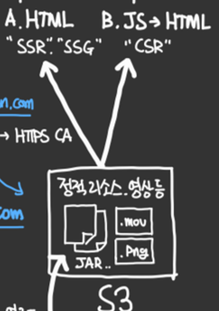 다시 프론트에서 HTML를 그대로 가져오는 방법과 JS를 통해서 HTML을 그리는 것은 S3에서 가져온다.