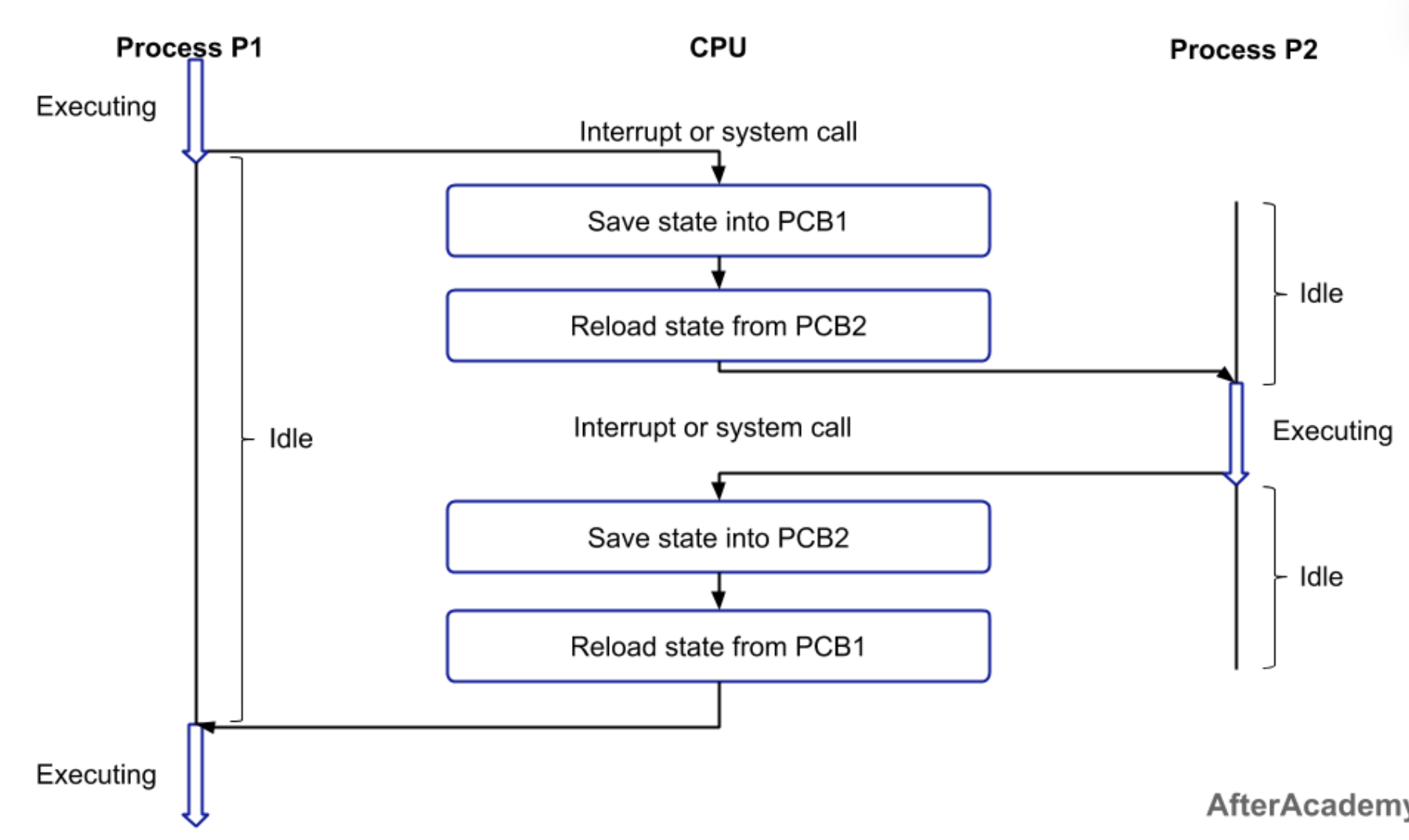 멀티프로세스 환경에서 CPU가 어떤 하나의 프로세스를 실행하고 있는 상태에서 인터럽트 요청에 의해 다음 우선 순위의 프로세스가 실행되어야 할 때 또는 대기하고 있던 다음 순서의 프로세스가 동작해야 할 때 기존의 프로세스의 상태를 저장하고 CPU가 다음 프로세스를 수행하도록 새로운 프로세스의 상태로 교체하고 이전에 보관했던 프로세스의 상태를 복구하는 작업입니다.