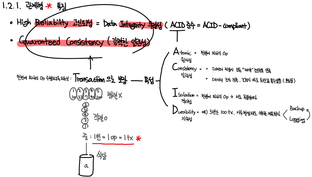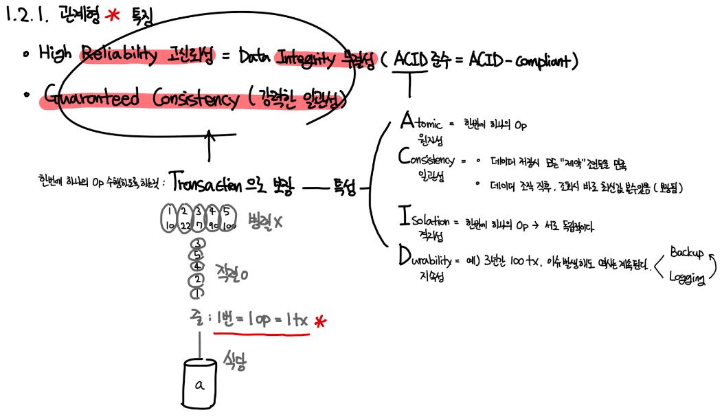 RDBMS는 데이터의 중복을 최소화하고 구조 변경이 쉽고 SQL 언어를 사용하여 데이터를 쉽게 조작할 수 있는 장점이 있다. 또한 ACID 원칙을 준수하여 데이터의 무결성과 일관성을 보장한다. 그래서 RDBMS는 현재 가장 널리 사용되는 DBMS로서 우리가 익히 잘아는 MySQL, Oracle, SQLite 등이 있다.