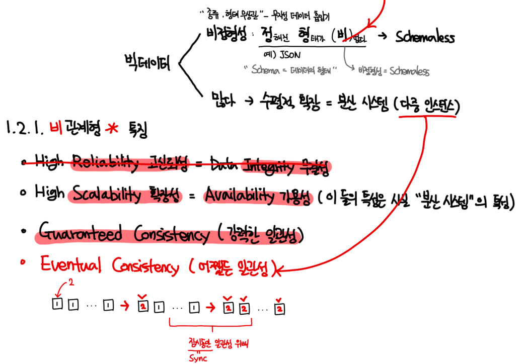 RDBMS보다 확장성과 가용성이 높고 유연한 스키마를 가지는 장점이 있지만, 데이터의 일관성이 항상 보장되지 않고 기존 SQL과 호환되지 않는 단점이 있다.