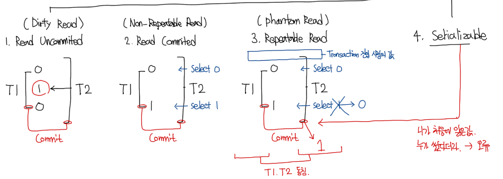 격리 수준이 높은 순서대로 SERIALIZABLE, REPEATABLE READ, READ COMMITTED, READ UNCOMMITED가 존재한다.