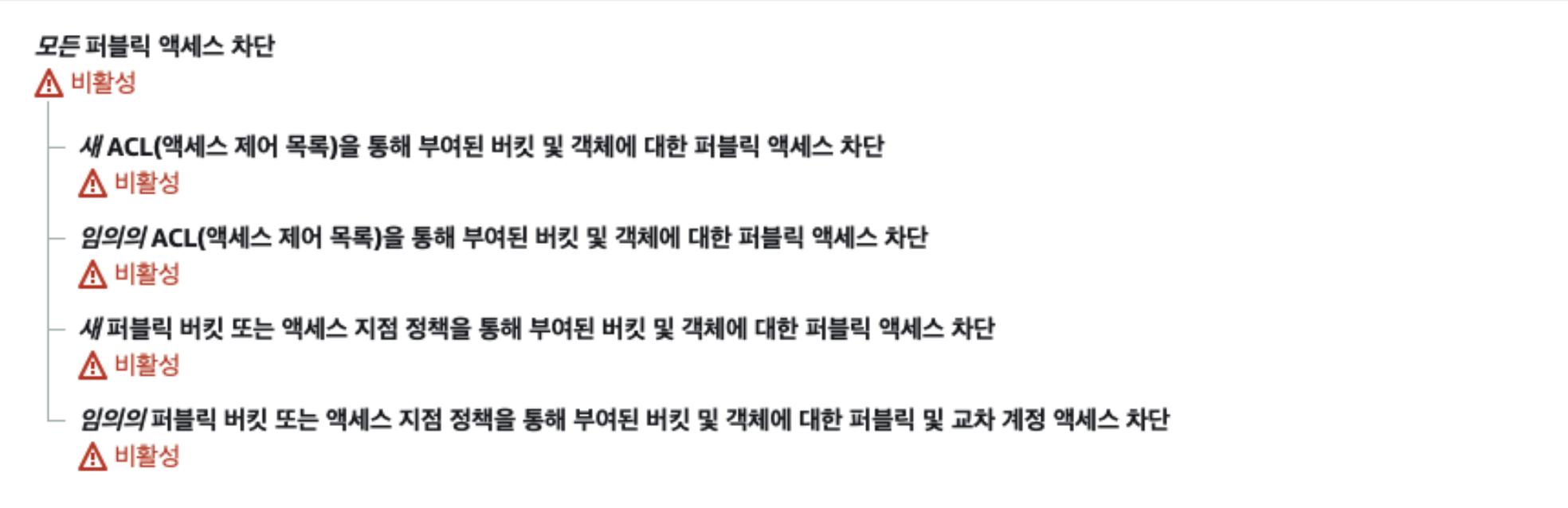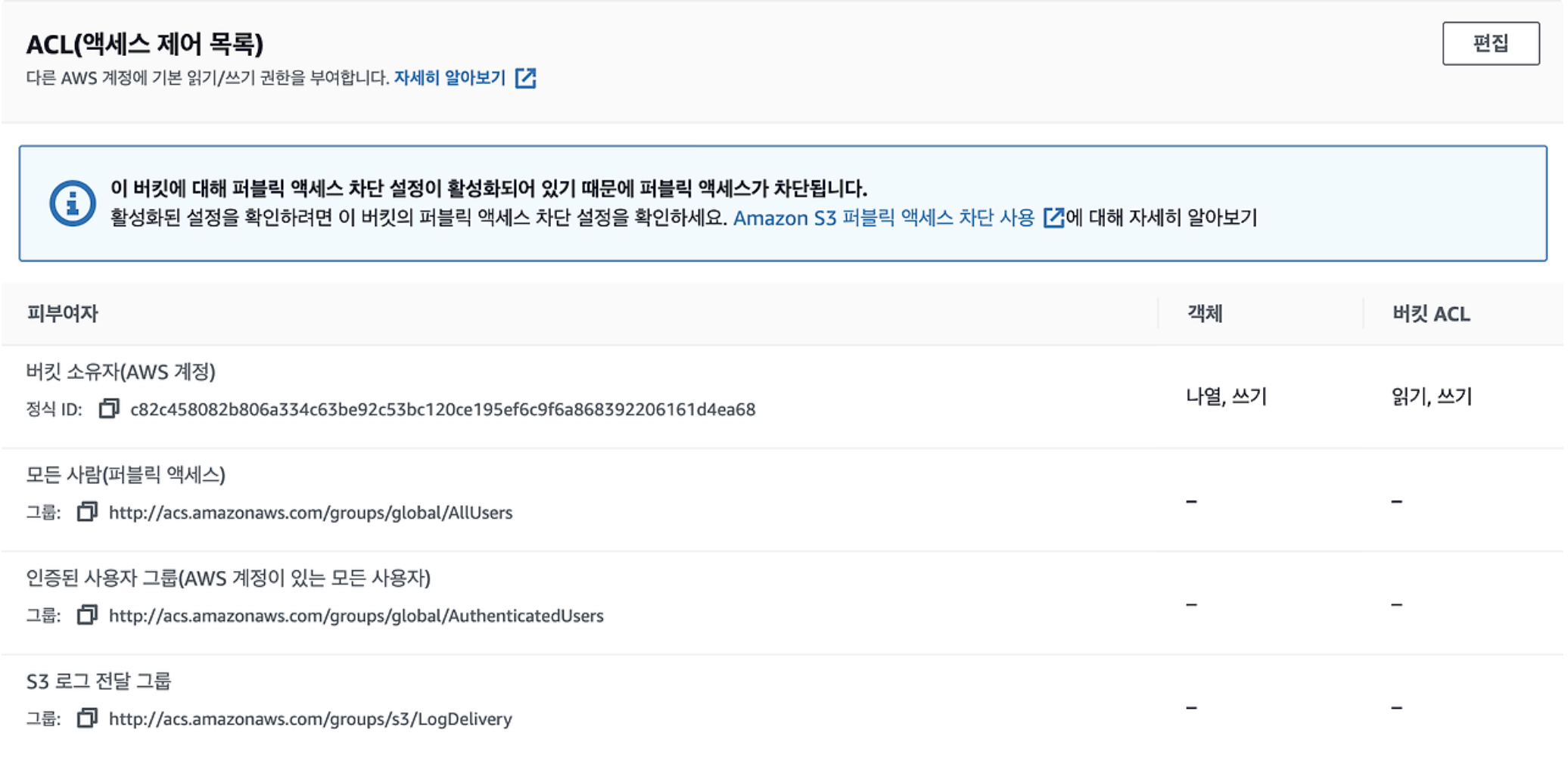 AWS에서 S3의 권한에 가보면 퍼블릭 액세스 차단(버킷 설정)이 있습니다.