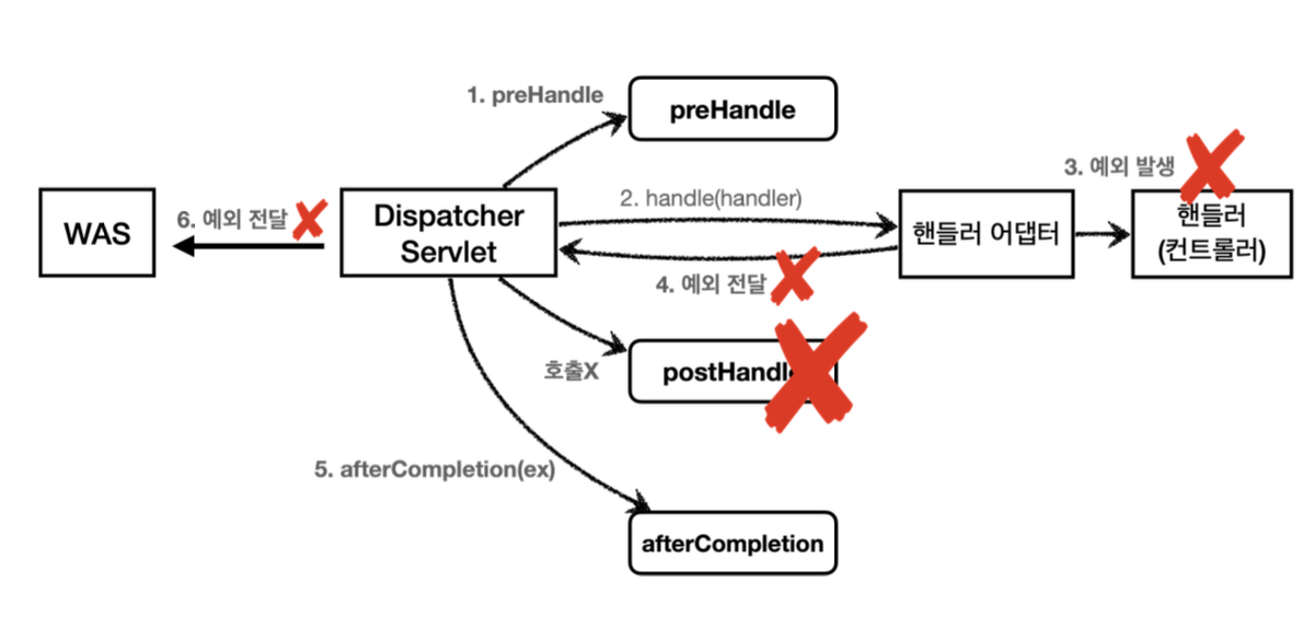 postHandle: 컨트롤러에 예외가 발생하면 postHandle은 호출되지 않습니다.