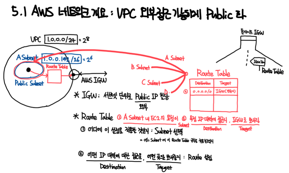 게이트웨이를 통해 외부로 나가면서 Private IP를 Public IP로 변환하지만 AWS에서 Public 서브넷은 IGW와 떨어져 있기 때문에 이를 연결하기 위해서는 Route Table을 사용해야 한다.