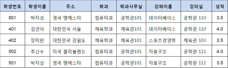 학생과 수강 그리고 성적의 속성에는 의존성이 존재한다고 표현할 수 있다. 의존성은 501이라는 학생 번호를 보면 학생 이름이 박지성으로 정해지는 관계를 의미한다.
