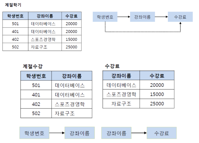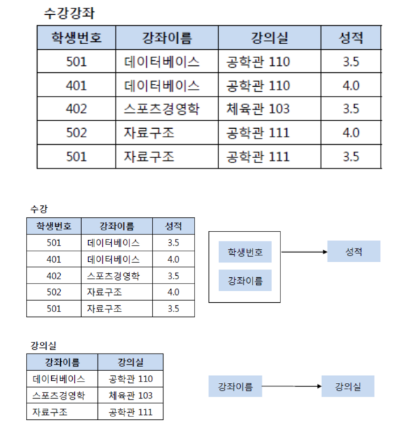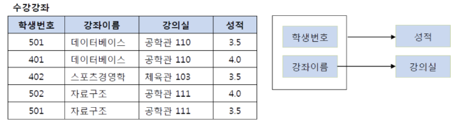 그 외에도 아래의 그림에는 학과 -> 학과사무실, 강좌이름 -> 강의실과 같은 종속관계가 있다.