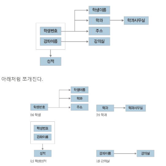 그렇기 때문에 BCNF 정규화를 만족시키기 위해서 위의 테이블을 분해해야 한다.