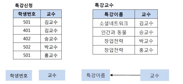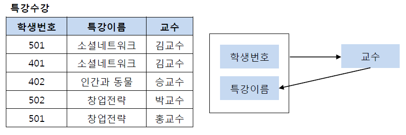 기본키는 (학생번호, 특강이름)이다. 그리고 기본키 (학생번호, 특강이름)는 교수를 결정하고 있다. 또한 여기서 교수는 특강이름을 결정하고 있다.