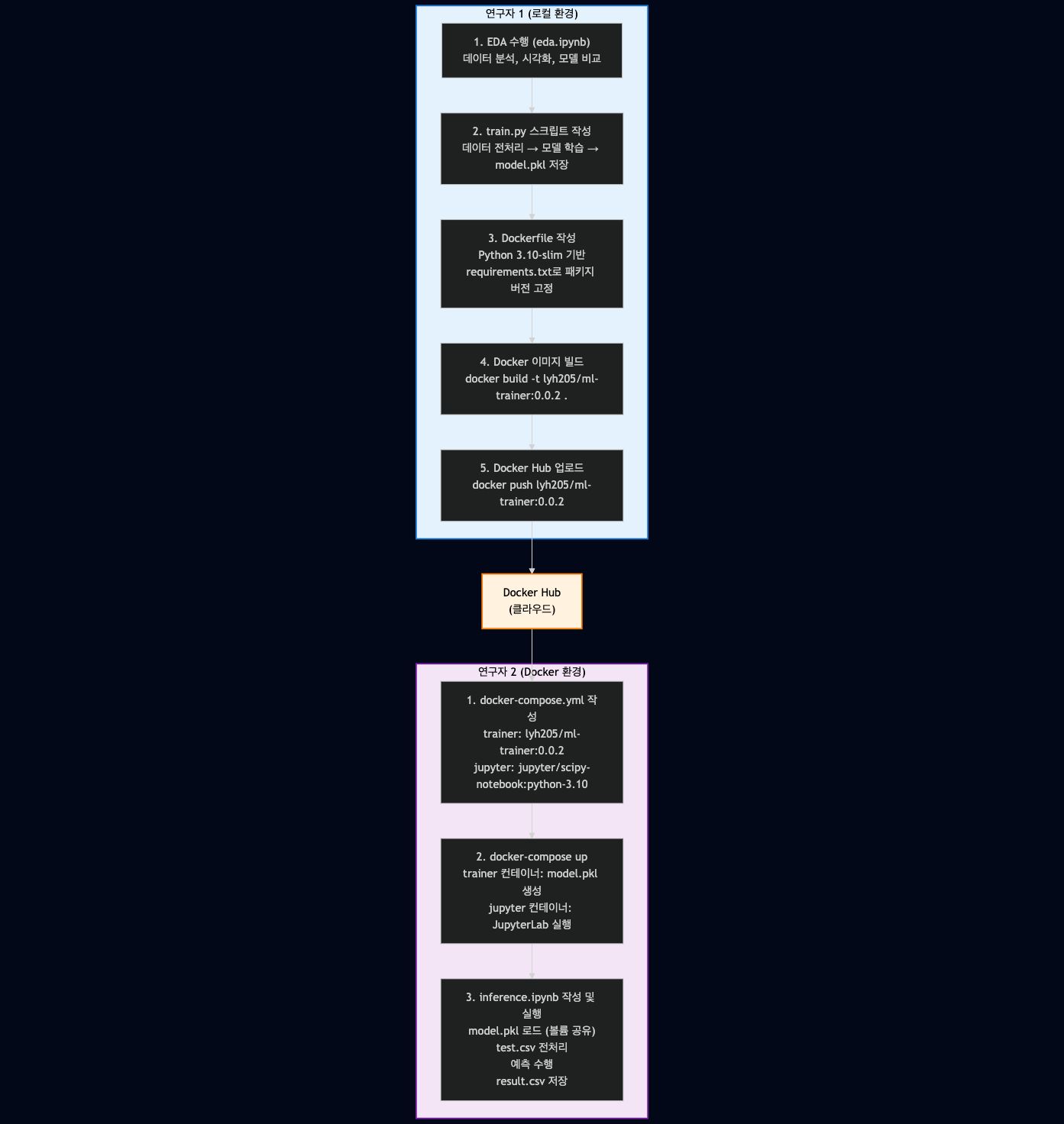 train.csv 데이터를 기반으로 Jupyter Notebook(.ipynb)에서scikit-learn을 사용한 회귀 모델링을 수행한다. model.pkl 파일로 저장한다. .py 스크립트로 정리한다. docker-compose로 구성한다.model.pkl 파일과 컨테이너 내부의 test.csv 파일을 활용하여result.csv 파일로 저장한다. (참고: [연구자 2]는 사전에 데이터나 모델 파일을 보유하지 않은 상태이며,