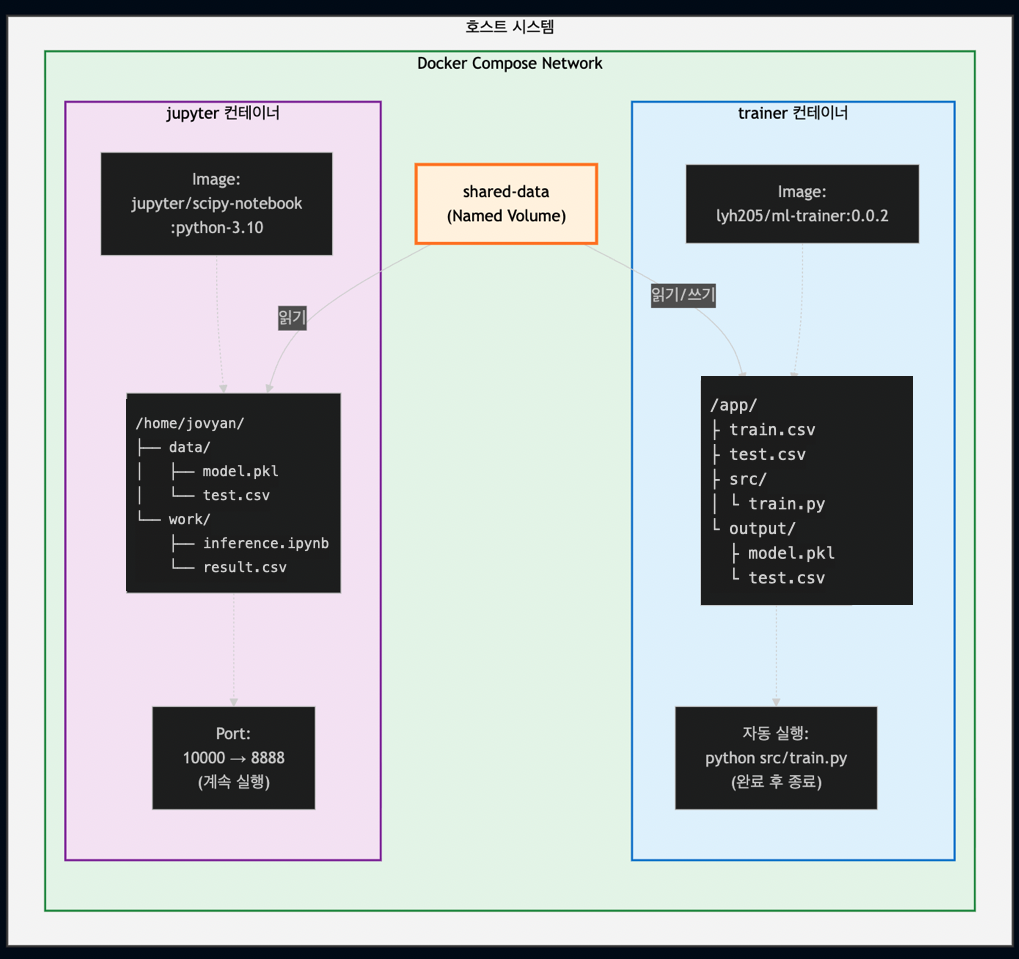 - shared-data:/app/output # 쓰기 (model.pkl 생성)