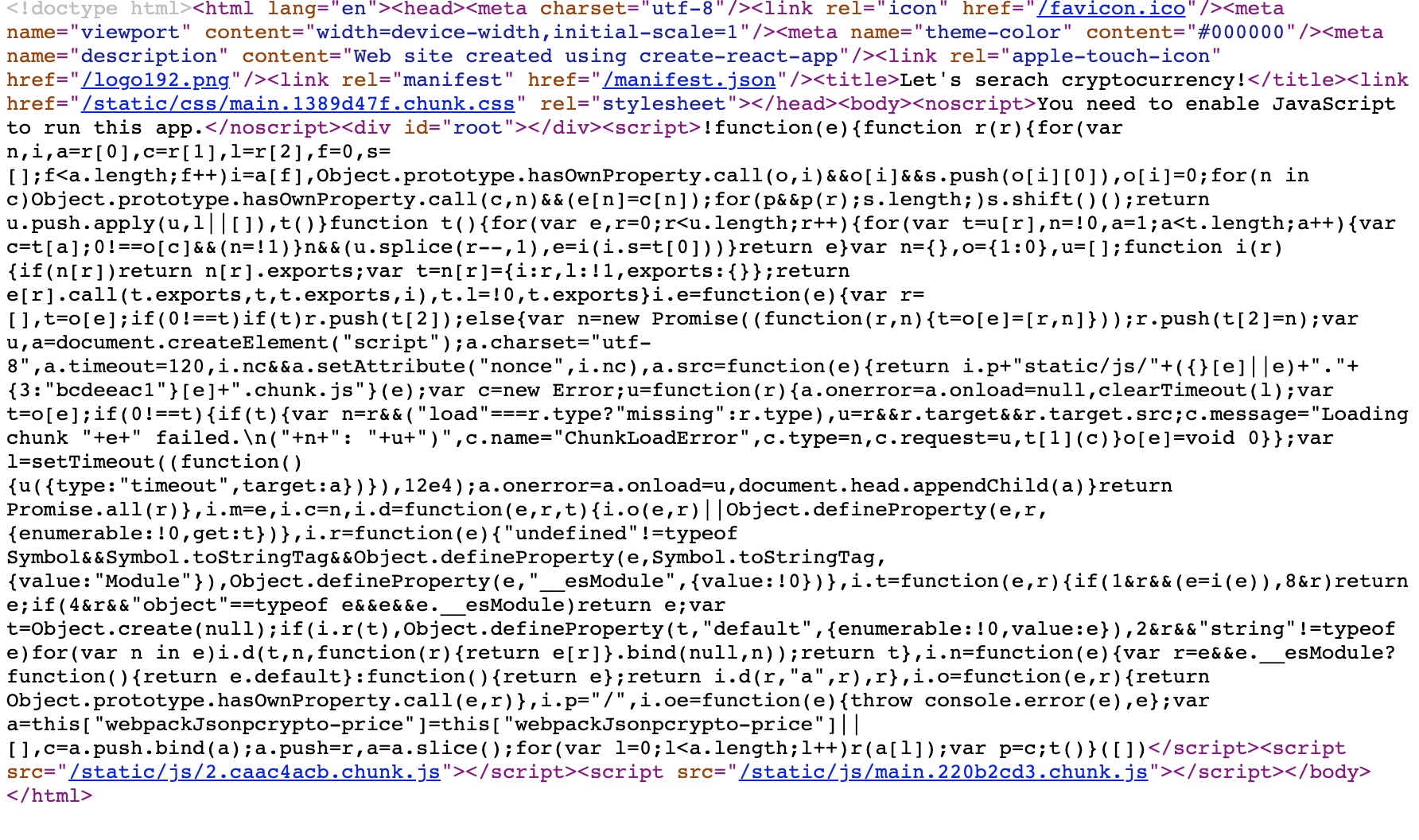 그리고 '페이지 소스보기'를 하면 컨텐츠가 다 보인다. 사람에게도 보인다면 웹 크롤러에게도 보인다. 리액트로만 이루어진 페이지에다가 '페이지 소스보기'를 하면 아래 캡쳐처럼 컨텐츠 대신 이상한(?) 내용만 보인다. 이래서 next.js를 사용하면 seo에 좋다고 하는거구나 싶다.