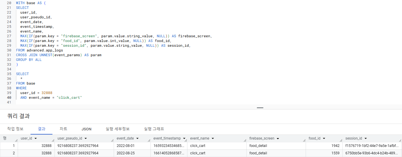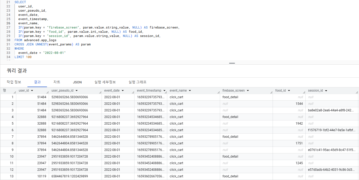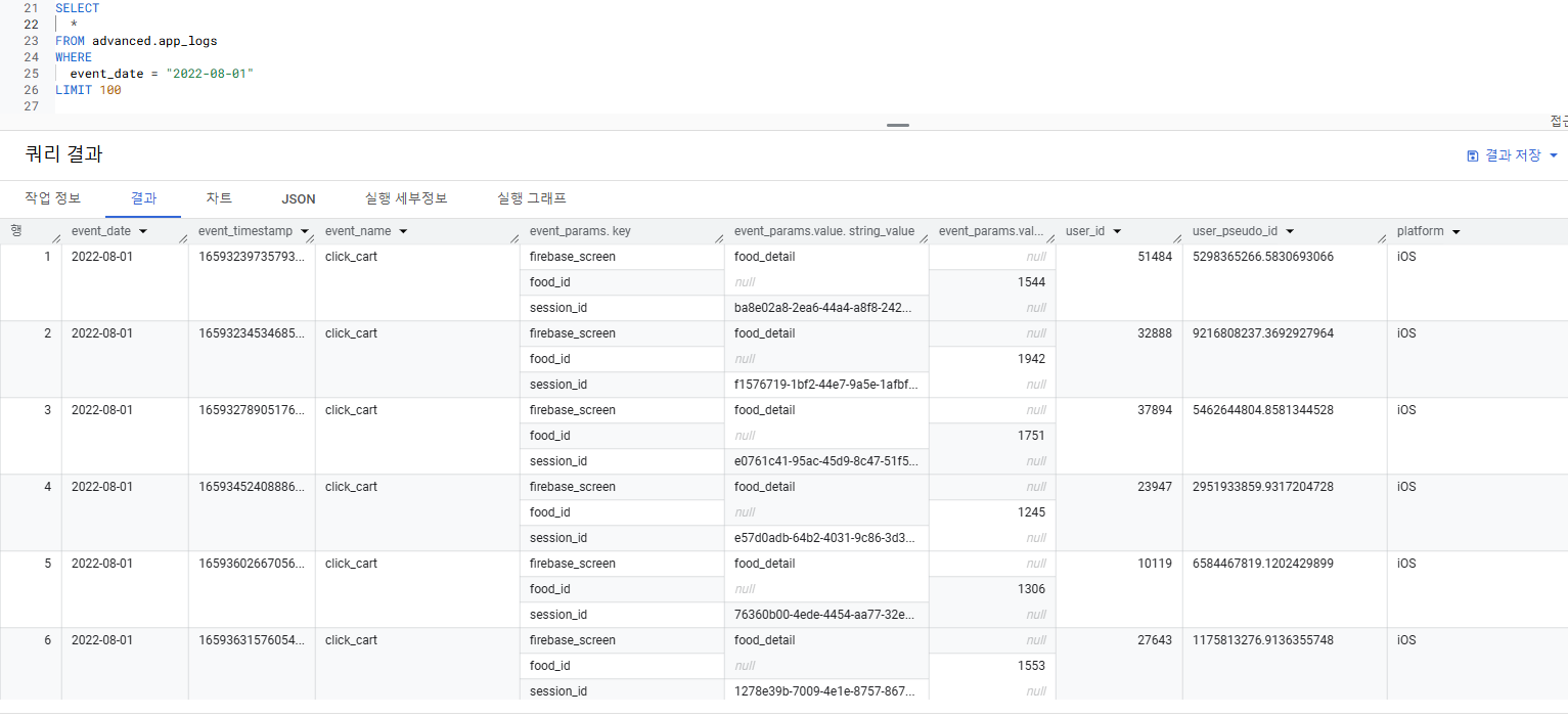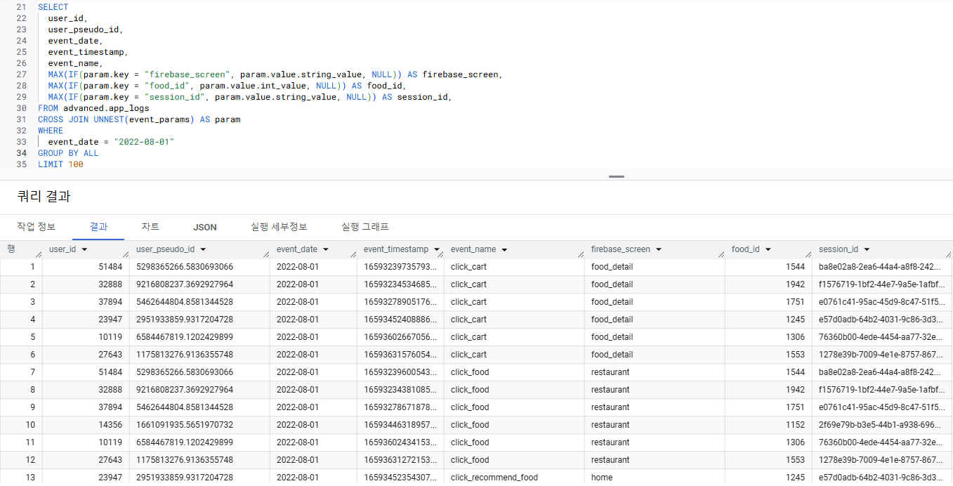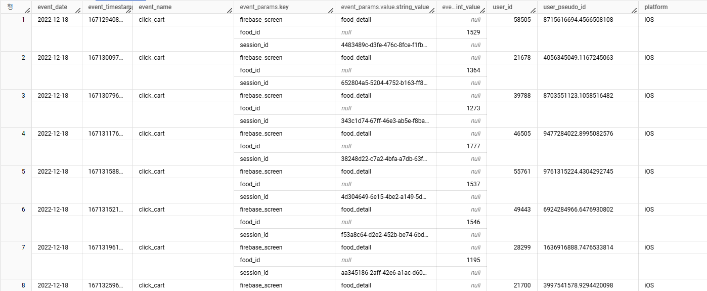 user_id | user_pseudo_id | event_date | event_name | firebase_screen | food_id | session_id