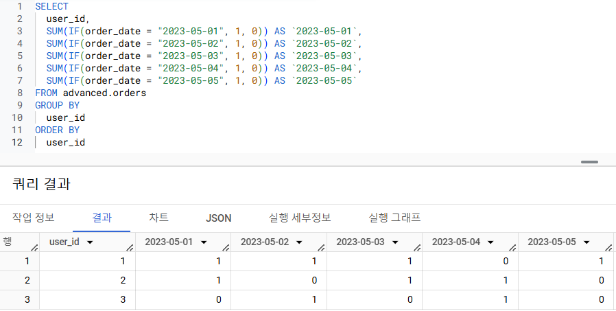 유저 별(user_id), 날짜 별(order_date)로 주문 횟수를 구해주세요. user_id를 행으로 order_date를 열로 만들어주세요.