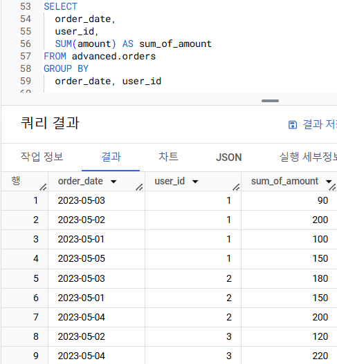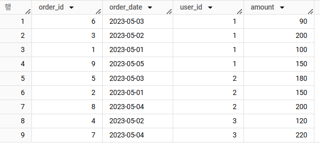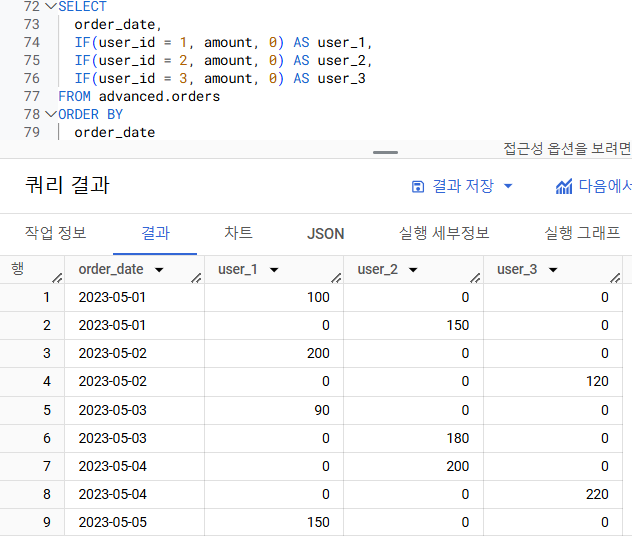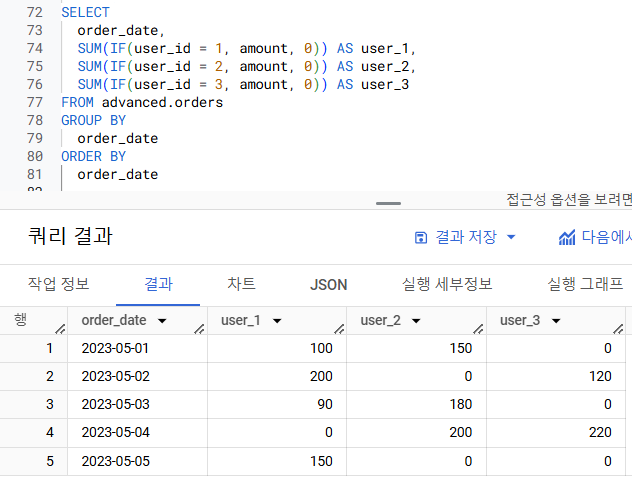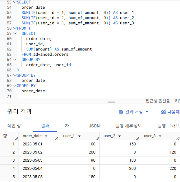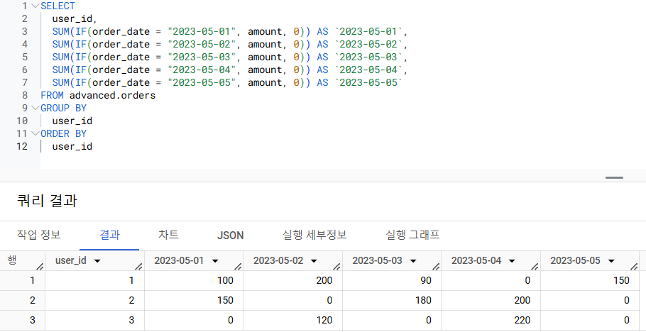 위 테이블에서 user_id(유저)별로 amount(주문금액)의 합계를 pivot해주세요. order_date를 행으로, user_id를 열(Column)으로 만들어주세요.