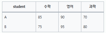 | student | 수학 | 영어 | 과학 |